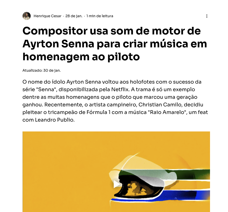 O nome do ídolo Ayrton Senna voltou aos holofotes com o sucesso da série "Senna", disponibilizada pela Netflix. A trama é só um exemplo dentre as muitas homenagens que o piloto que marcou uma geração ganhou. Recentemente, o artista campineiro, Christian Camilo, decidiu pleitear o tricampeão de Fórmula 1 com a música "Raio Amarelo", um feat com Leandro Publio.